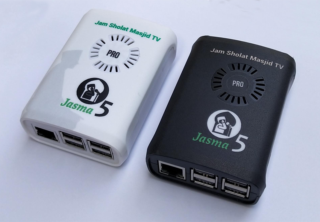 Jasma menggunakan perangkat keras utama berupa Raspberry Pi 3B+ yang banyak dijual di pasaran. Jadi kalo ingin membangun sendiri jam sholat modern, bisa membeli sendiri perangkat ini. Catatan: Semua fitur jam sholat akan tersedia namun dalam mode demo. Pada mode ini terdapat watermark "Demo...." ditengah layar.